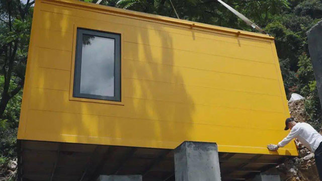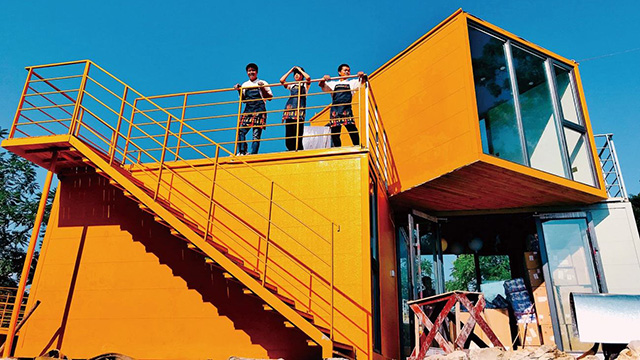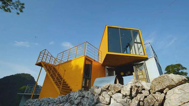 9月1日,在接近半年的籌備后,集裝箱民宿竣工了。檸檬黃的集裝箱,碼在明朗的藍(lán)天底下,鋪的路、修的圍擋用的都是山里現(xiàn)成的石頭,每間房有空調(diào)、馬桶、榻榻米,集裝箱上面是一個(gè)觀景臺(tái),白天看日升月落,夜晚則可以觀星。