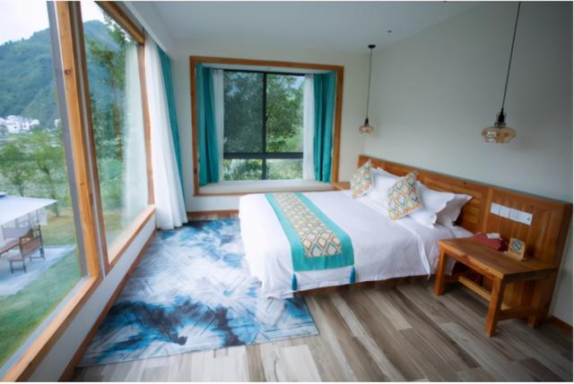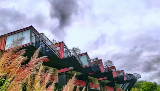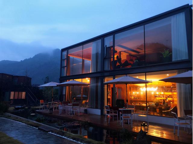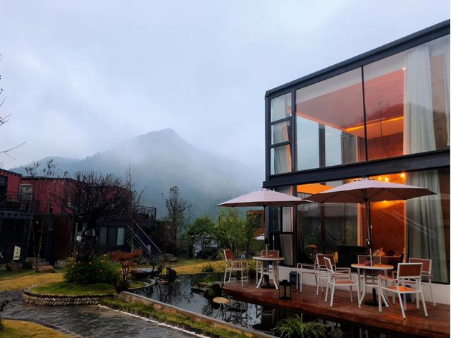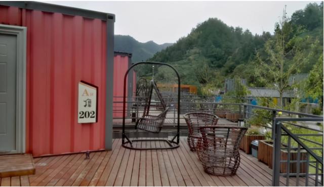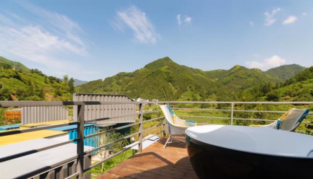 獨特集裝箱建筑坐落于美妙的山水之間,房間露天陽臺正對著外面的大山和流水,晚上能聽到靜靜地流水聲,落地大窗戶,躺在床上就能看到遠處的風景。
