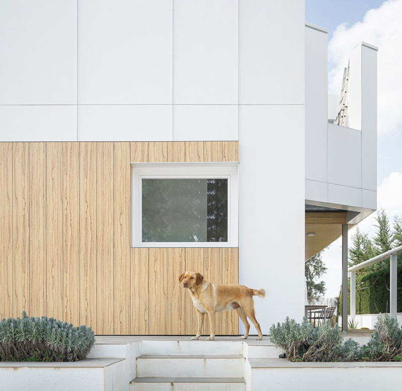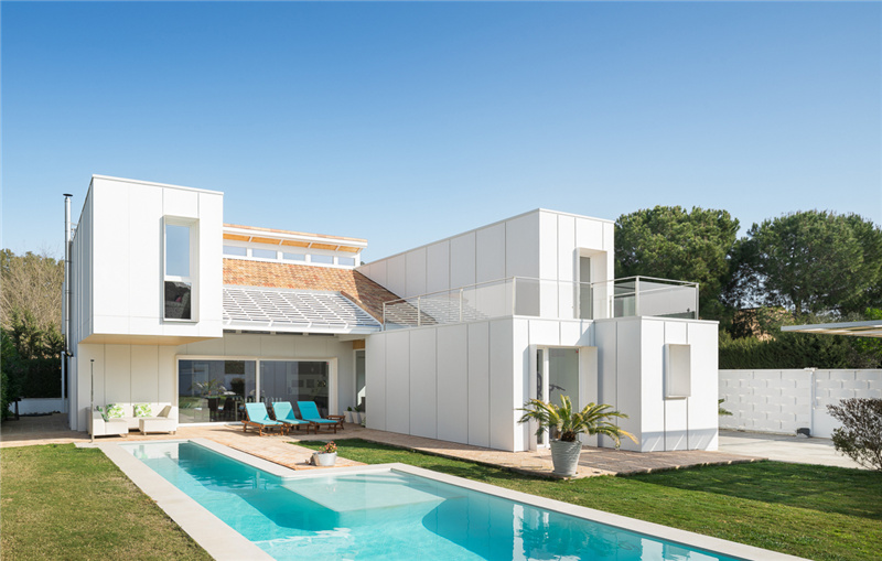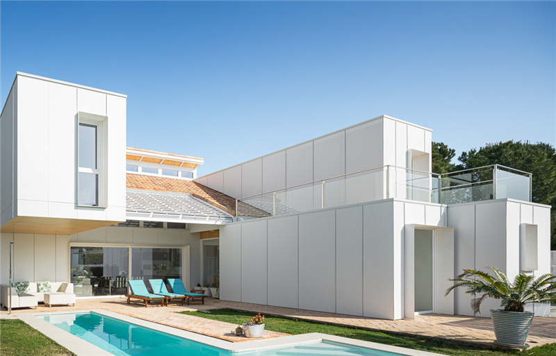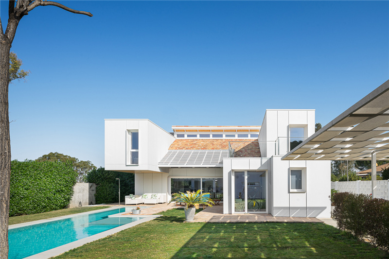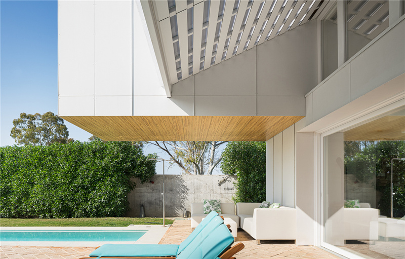 延伸到游泳池上方的容器創建了一個舒適的門廊,利用遮陽板將其與北面的建筑物相連起來,可以將客廳放置中部的空間里。第一眼看到該集裝箱房屋的白色涂料外觀,就會有一種平和的感覺。與傳統的容器式建筑相比,這種一以貫之的設計讓房子看起來更現代。