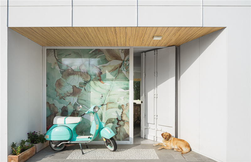 集裝箱的整個金屬板被切割,兩個翻轉形成了一個夾層,另一個五米的集裝箱延伸到房屋前方,并利用固定門的設計支撐整個夾層。作為第一視角,第一個兩層的體量幾乎覆蓋了整個建筑的表面,在穿過房門后起到了屏障的作用,同時也實現了更連通的活動空間。