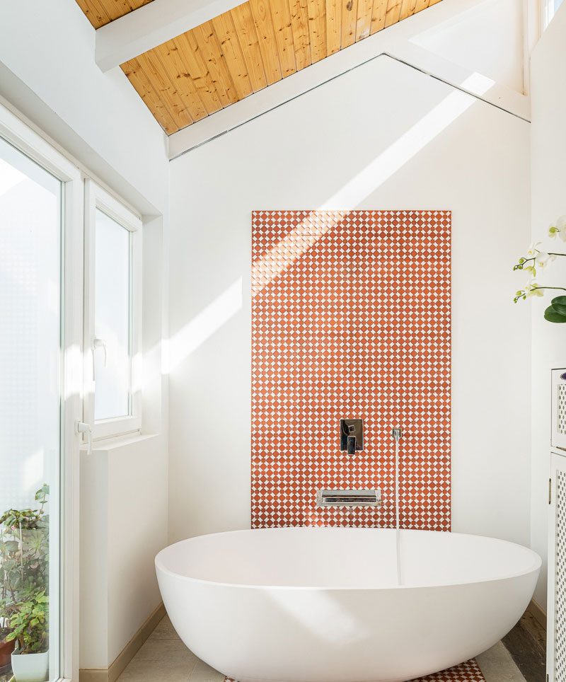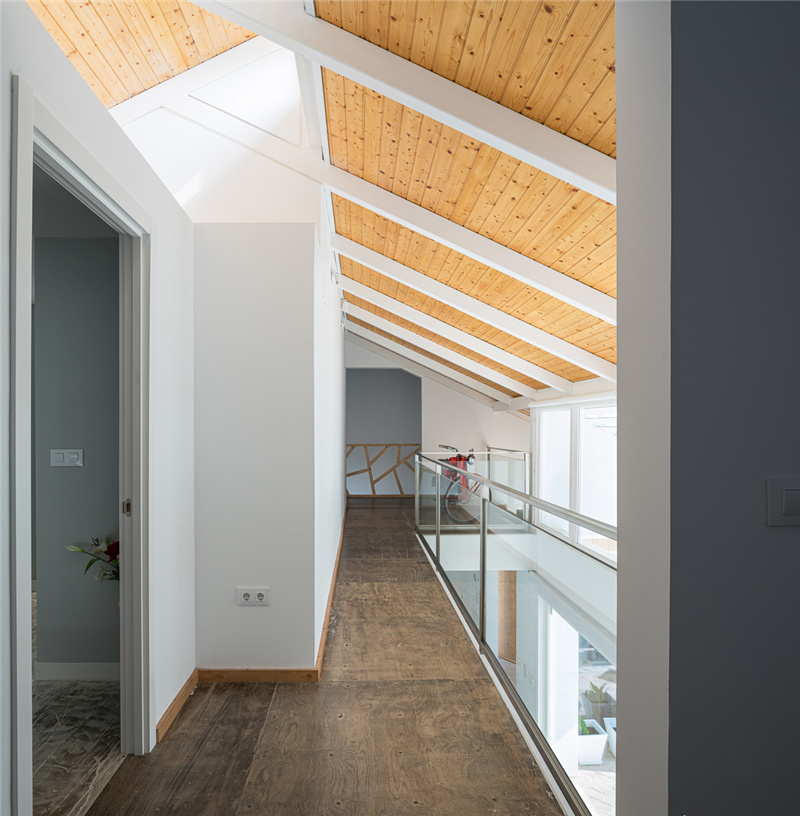屋內采用復式結構,使空間看起來更為寬敞。房屋的屋頂以木板覆蓋,實現室內保溫的作用。其中,恰到好處的落差創造了一個透光的天窗,為該樓層的臥室和衛浴間打造了明亮且舒適的居住環境。