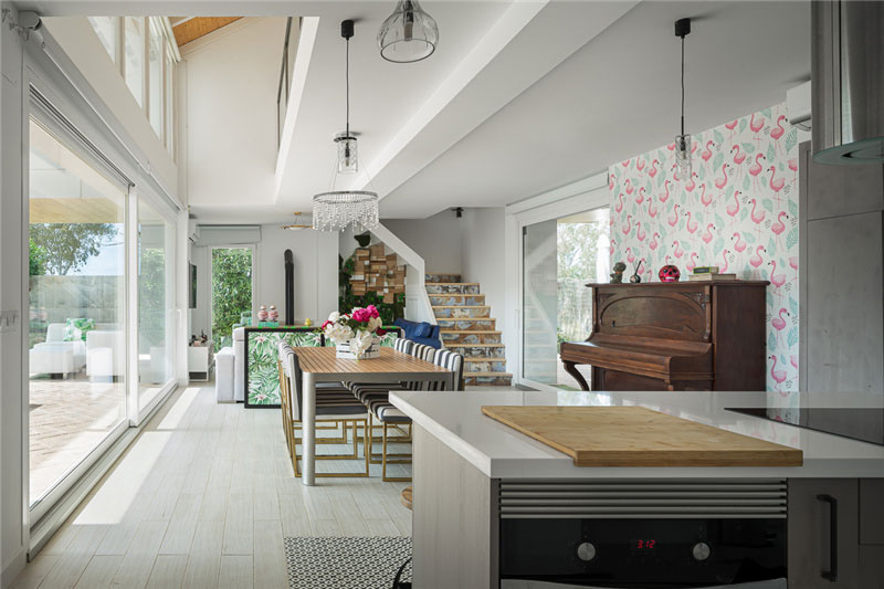屋外優美的景色通過大面積的落地玻璃窗透進屋內,即使身處室內也能為寧靜的美景著迷。房屋內部布置了簡單的細節,開放式的廚房和就餐區為生活預留了更多的活動空間,把全景玻璃門推開便可以連通戶外的泳池。