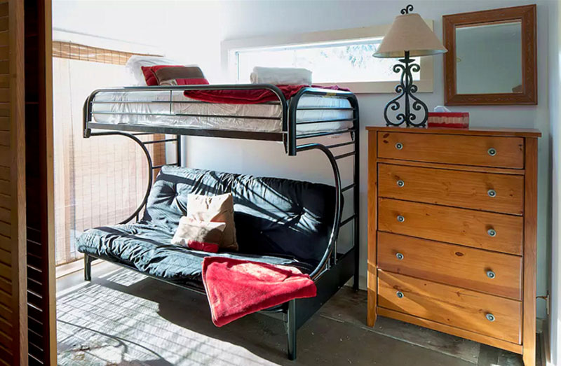 一樓主臥光線透過床邊的窗戶照射進來,床頭墻壁掛上藝術畫作,非常舒適。主臥隔壁的雙層坐床房,下層即可用作椅子也可做床使用,上層還有一張獨立小床,竹簾的窗戶裝飾非常別致。