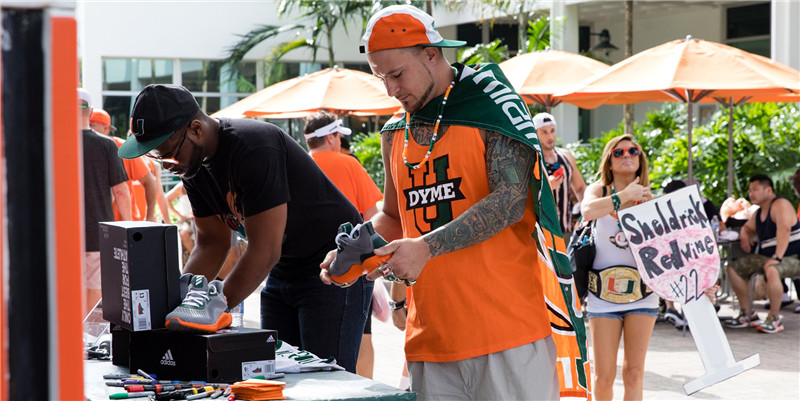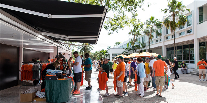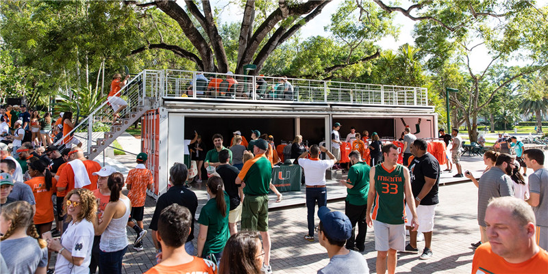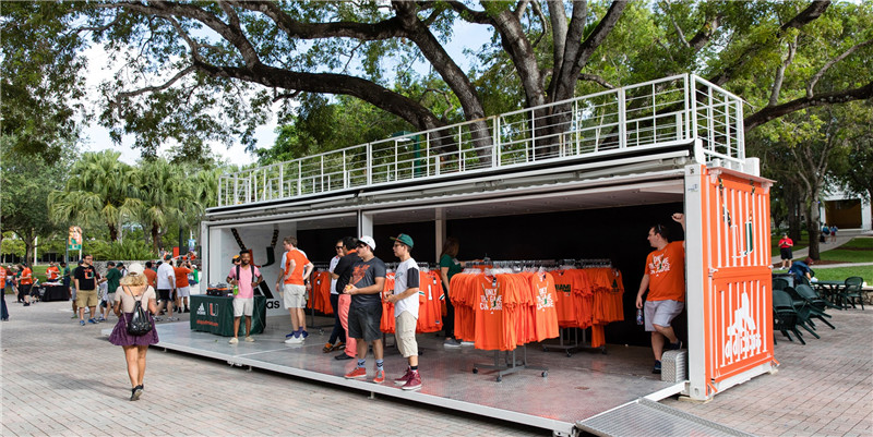 改造后的集裝箱主要用于展示和銷售阿迪達(dá)斯與邁阿密大學(xué)的聯(lián)名服裝,建筑外殼使用了和服裝一樣的主打色——代表活力的鮮橙色,并繪有標(biāo)志著比賽精神和力量的“金色周轉(zhuǎn)鏈”。建筑的內(nèi)墻上設(shè)有簽名墻,學(xué)生和球迷可以在比賽前寫下個人信息和鼓勵的話語來向他們的團(tuán)隊表示支持,這為比賽提供了一項互動活動。