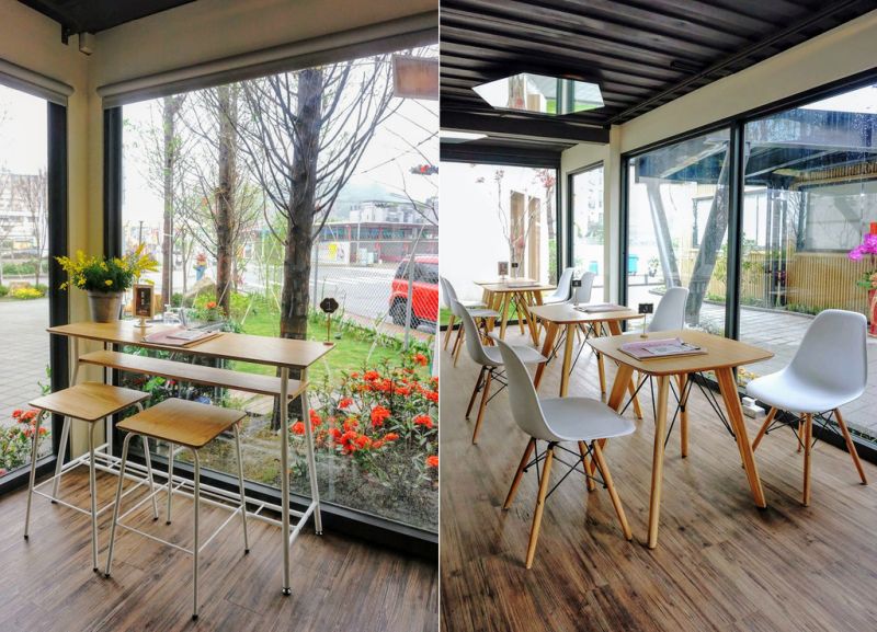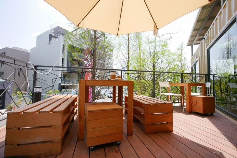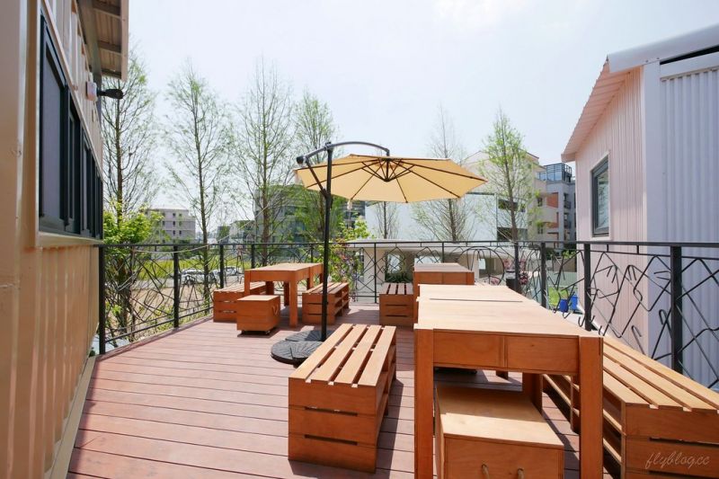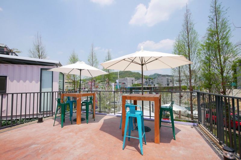 餐廳一共有兩層,二樓的用餐區包括了室內和室外。室內用餐區設置在單個集裝箱單元內,空間形狀呈長條形。室外的用餐區設置在戶外的多張木制沙發上,并安裝遮陽傘來提供舒適的就餐環境。