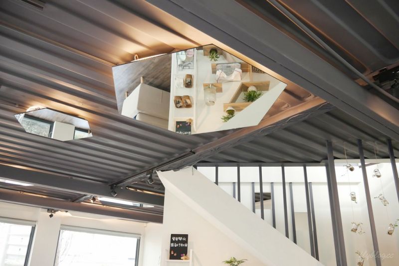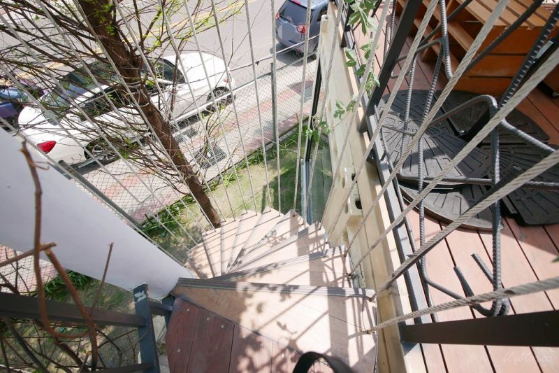 在二層的露臺參觀完之后,你可以選擇在建筑旁的鋼制旋轉樓梯下達一層,旁邊的樹可以遮蔽一部分陽光,不用擔心會很曬。