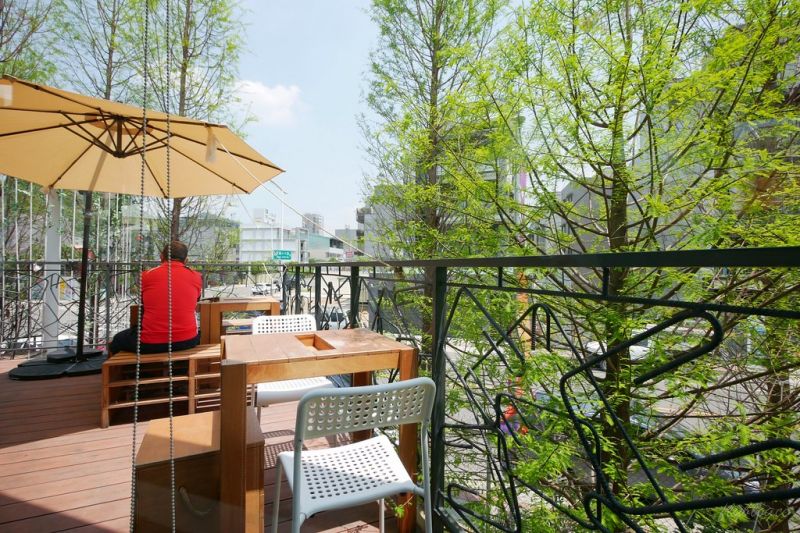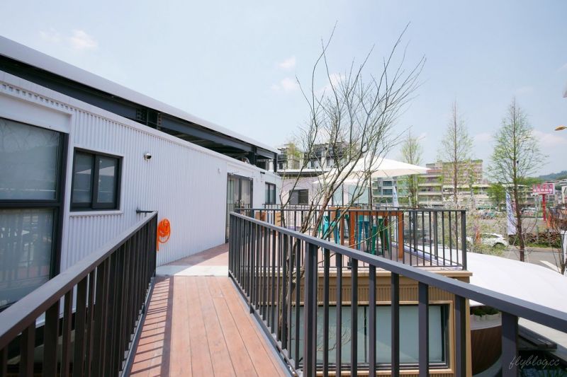 從二層的一條鋼制天橋可以通往另一個室外用餐區,在這里可以俯瞰到周邊的景色,配上藍天白云營造出悠閑的感覺。