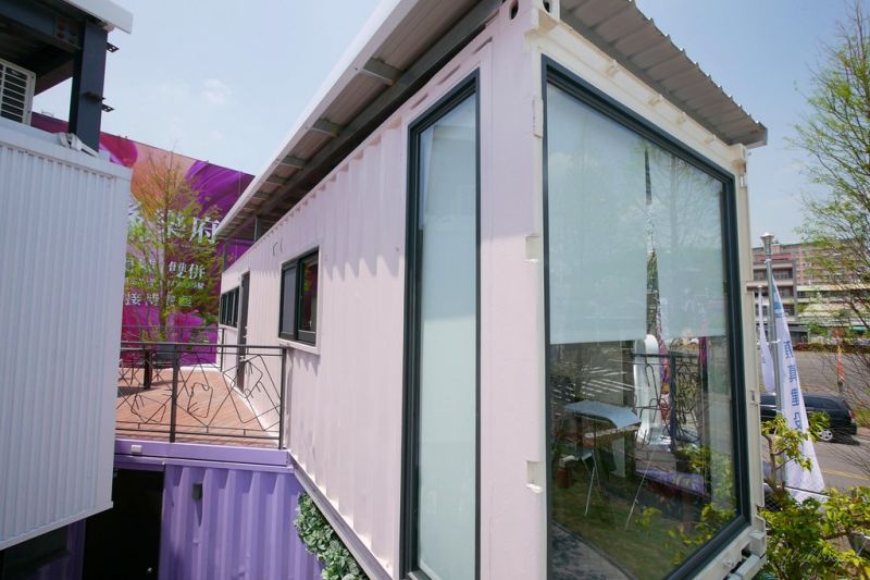 該景觀餐廳以集裝箱屋為造型,并設有草地和水池,擁有美麗的后花園,打造出自然和建筑相融的景觀帶。