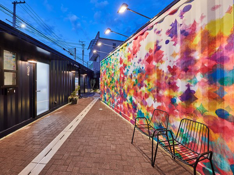 從箱間的小道進去,便可以到達酒店內部。咋一看這酒店好像很低調的樣子,全黑的外殼沒有什么亮眼之處。但是當你走進內部你就會發現它的“色彩秘密”——一朵朵綻放的白色之花,還有現場涂漆上去的七彩顏料就像是地上彩虹一般的絢麗。