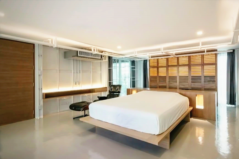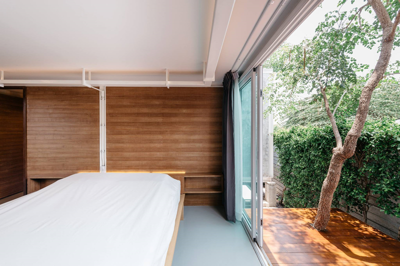臥室的使用空間也是非常寬敞的,少不了中心簡(jiǎn)潔的大床,一旁有嵌入式桌子和一看就是很舒服的設(shè)計(jì)的椅子,完全符合整個(gè)臥室的格調(diào)。這里可以看到風(fēng)味十足的波浪板,為臥室的墻體增添一點(diǎn)不同。而有的臥室外面就是陽(yáng)臺(tái),伸手可及的樹(shù)木就是與自然和諧相處的標(biāo)記,仿佛住的不是房子,而僅僅是睡在樹(shù)下而已。