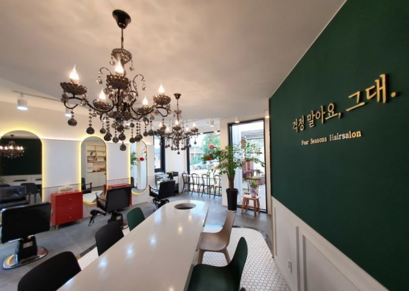 進入美容院室內,內部環境就和外觀一樣整潔和清新。工作區內放置沙龍椅、鏡子和工作柜等,配套齊全的美容美發工具。白、綠搭配的裝潢色調營造了高級奢華的氛圍感,并在天花板安裝水晶吊燈點綴。