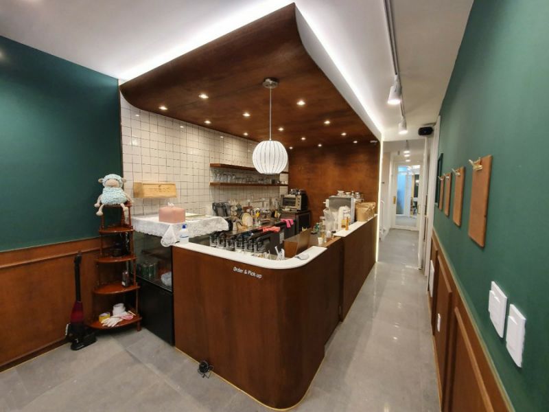 從工作區走到美容院的另一個功能區,這邊是配備了茶水間的休息區,為顧客提供貼心的等待區域。角落的吧臺使用木制材料覆蓋,并配備齊全的茶水調制工具,休息區內放置了許多簡易的木制桌椅,靠窗而設的卡座可以欣賞到戶外的美景。