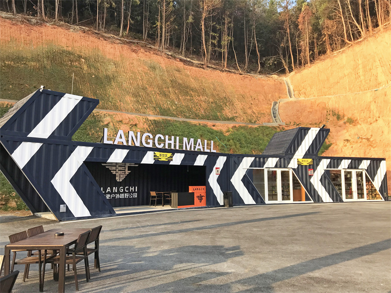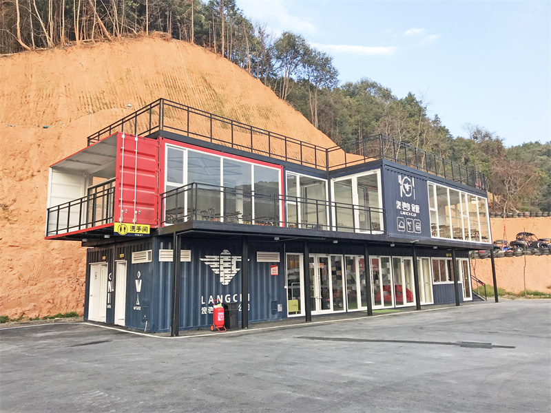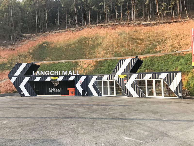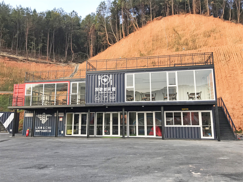 靠進(jìn)山腳的一邊還有一座以黑色為主打色的休息區(qū),同樣是由集裝箱改造而成的二層建筑。這座建筑的特色在于由其原始箱門打開而形成的露臺,在底層面積比上層少的情況下,二層用了鋼架構(gòu)來加固。