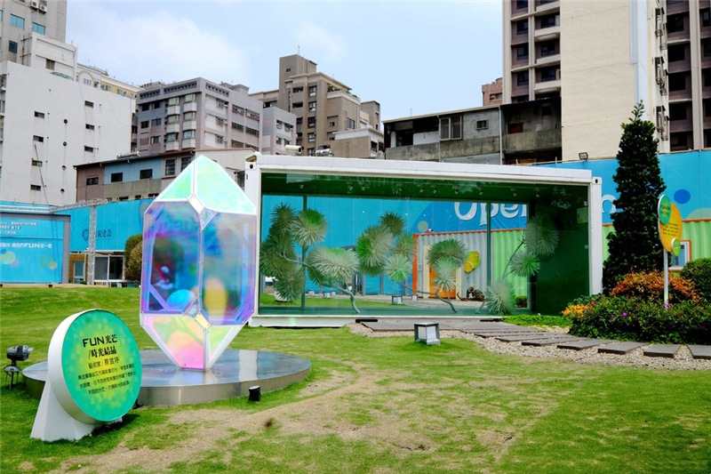 從旁邊的小道進去,就可以繞著藝術園進行順時針的參觀游覽。首先是一個名為“FUN 光芒”的作品,由雕刻藝術家設計并創造。發散陽光成為美麗光彩的水晶體就像時光的結晶,在不同時間角度的照耀下透析出不同的光芒。然后是一個“養著”青松的透明集裝箱,兩面箱壁替換成落地玻璃用于展示。