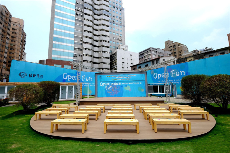 繼續往前走是一個色彩鮮艷的集裝箱和一堆鐵框,鐵框內鑲嵌上一些反光的材料,將鋼鐵元素玩出無限可能。再過來是一個“鏡子箱”,它們的前方剛好圍成一個露天舞臺,用于舉辦各種不同的藝術活動,一個大草坪實在太適合戶外玩耍了。