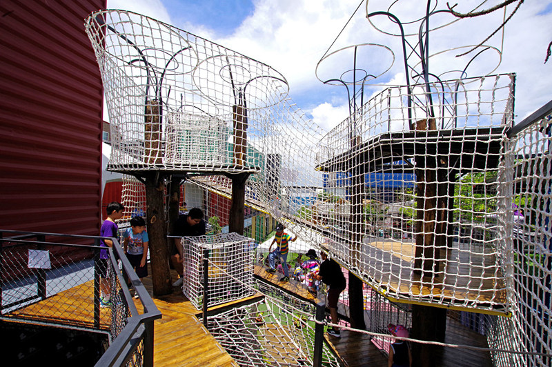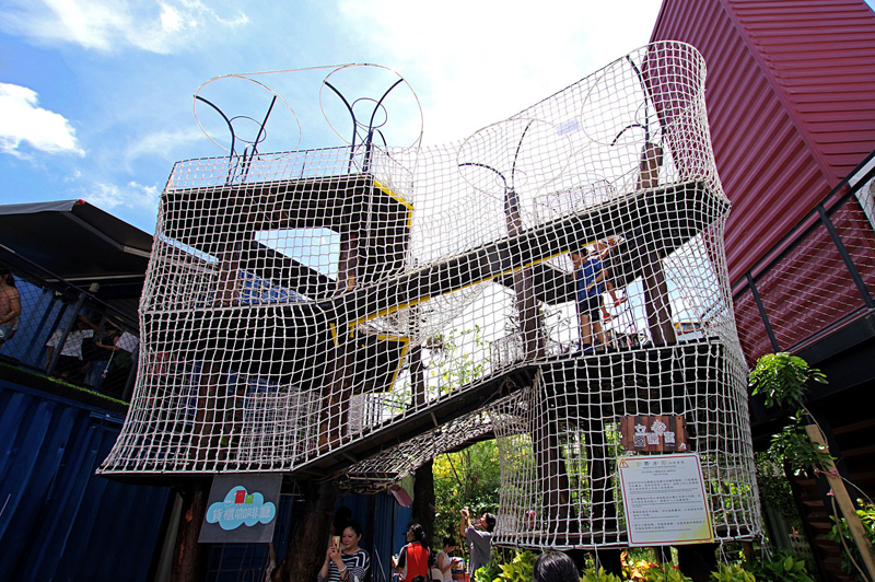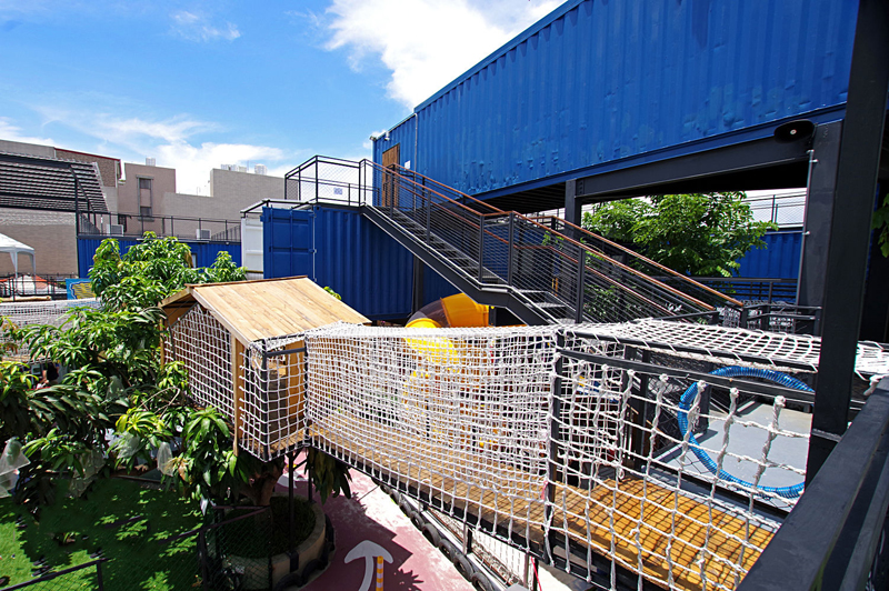 在另一面可以觀賞到樂園獨特的集裝箱建筑,用不同的色彩描繪不同的箱體,像積木一樣堆疊的形狀能喚起孩子心中的動手共鳴,說不定建筑工程師的興趣從此就建立起來了呢~