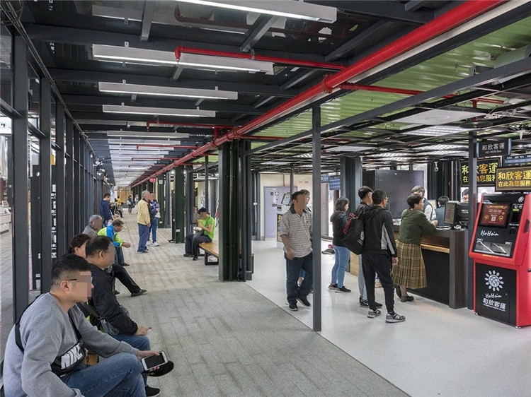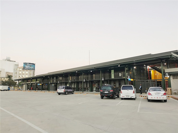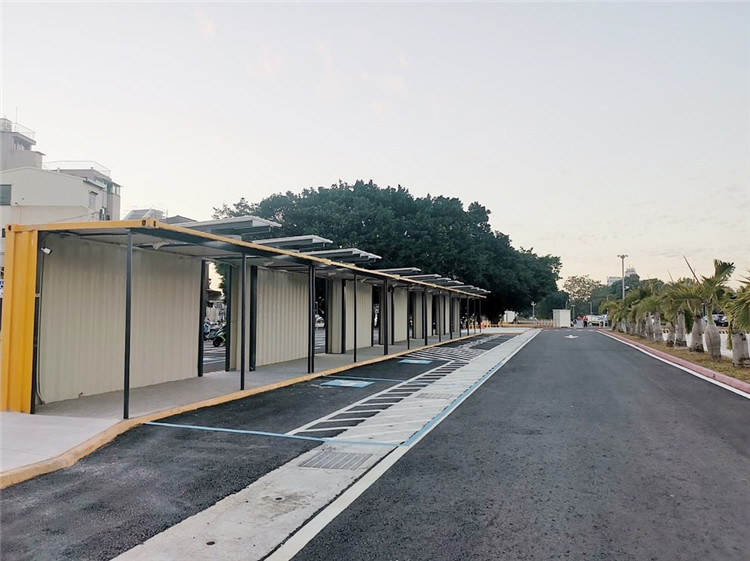 車站旁邊還規(guī)劃了出租車載客區(qū),客運(yùn)車上下客區(qū)和汽、摩托車停車場等,共有288席的小客車停車格、394席的摩托車停車格,全部建筑均由鋼架和集裝箱部件制成。