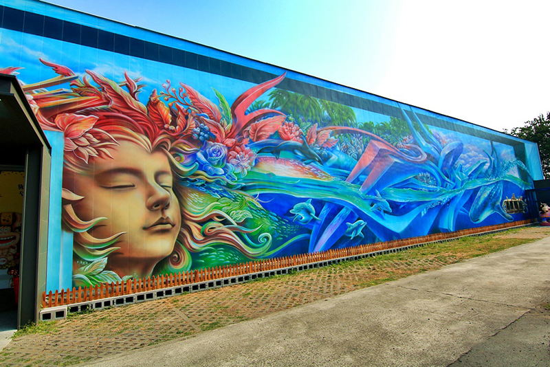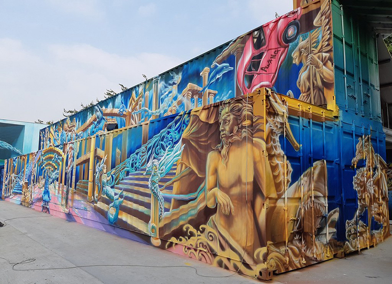 另一側(cè)的巨型集裝箱彩繪也是海洋世界,但呈現(xiàn)的是另一個主題,這個主題更加貼近自然生態(tài)的和諧統(tǒng)一,還有許多可愛的小動物躍然箱上。再過來是西方神話故事一樣的唯美人臉,巨型的畫作毫無斷層,銜接流暢,實屬創(chuàng)作不易。