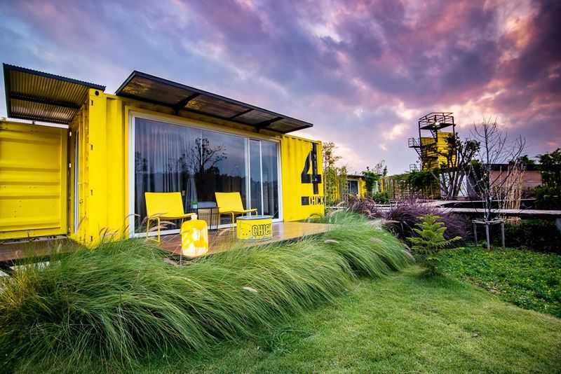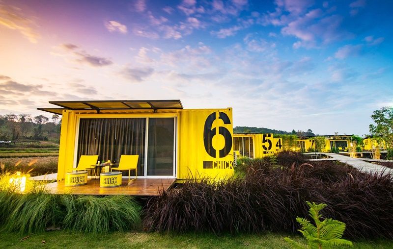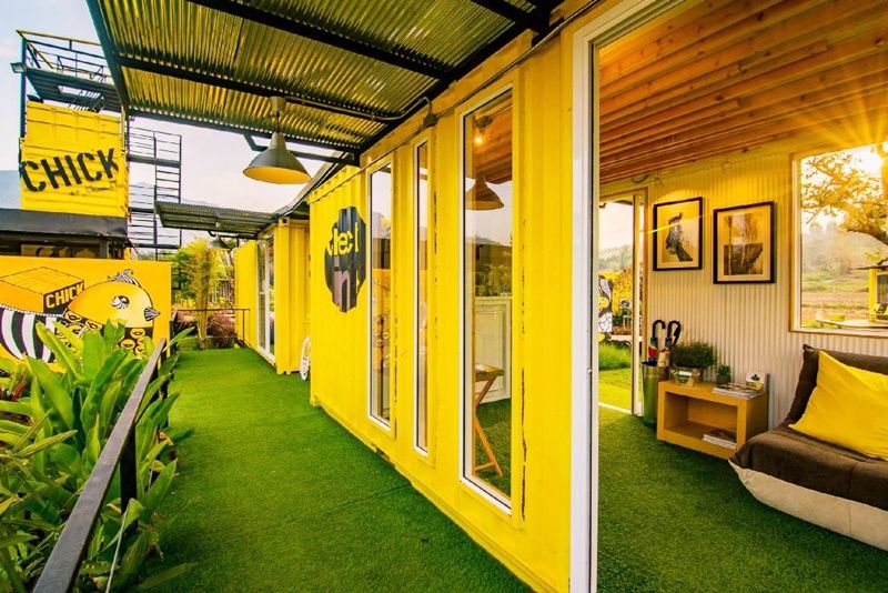 小雞度假村(Chick Resort)內建設公共服務區,同樣由集裝箱改造而成,并擁有高層眺望臺,使用豎直放置的集裝箱筑成。該度假村是一個注重自然友善服務的項目,別具一格的居住概念將尋常的集裝箱之家轉換成在山間和綠色稻田中的舒適臥室,讓游客們可以在新鮮的空氣中休息,倍感舒適和愉悅。