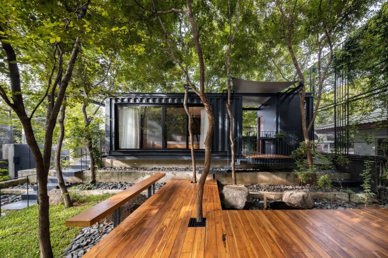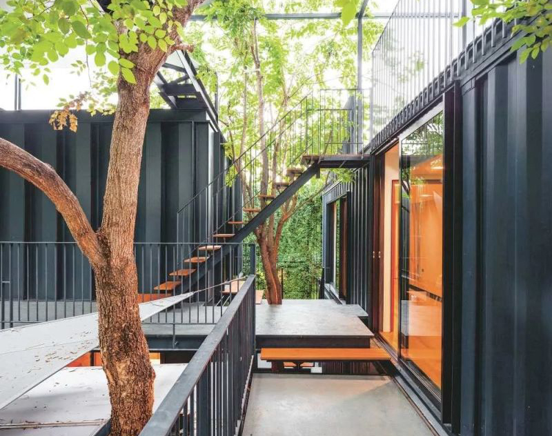 房屋的入口由一條從地面上升起的坡道形成,在柵欄的前面可以看到一個集裝箱亭子,里面有一個花園,連接著兩層樓的房子,是一個熱帶庭院中的集裝箱房子。集裝箱房屋的前部設計是高出地面的設計,各個生活功能區域的劃分明確,僅由前廊相互連接。