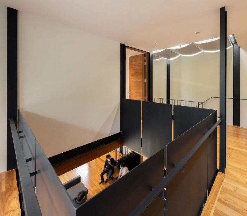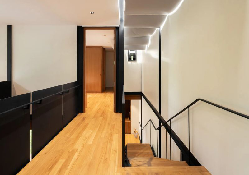 樓梯下的鋼制儲物架創造了額外的存儲空間,作為欄桿的鋼筋,它是木材與金屬的完美結合。二樓樓梯的頂部是一個天窗,在晴朗的日子可以露出天空,與樹木和諧相處;在不需要的時候則可以拉上窗簾,保持陰涼。