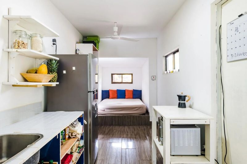 進入該集裝箱住宅的內部,你可以看到房間的入口是一道從集裝箱上切割下來的零件制成的滑動門。房屋兩側的窗戶和天花板的天窗都為室內帶來了充足的光線,使兩個集裝箱之間的大廳明亮且寬敞。