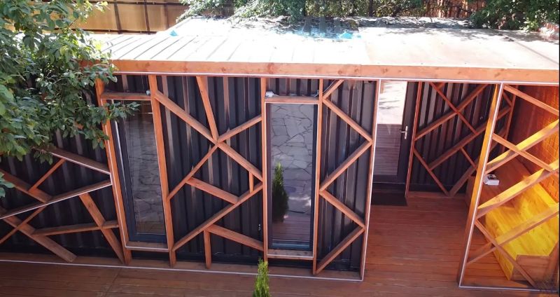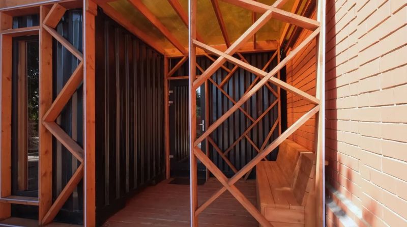 集裝箱房屋的周邊擁有多種休閑娛樂設施,能滿足住客的度假需求。可以看到,這座由40英尺集裝箱改造而成的房屋擁有一個極其時尚的外觀,波浪板壁被線條感十足的木條所覆蓋。整體結構分為兩個部分,房屋入口處擁有一個舒適寬敞的門廊。