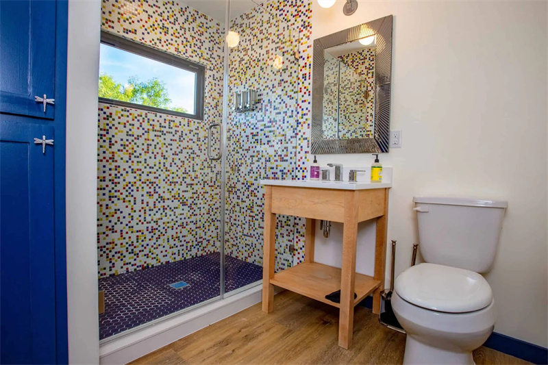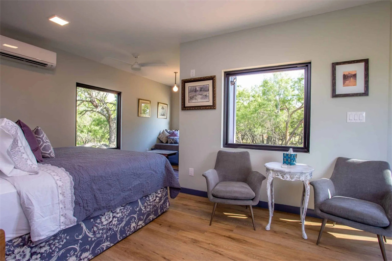 每個集裝箱房屋單元都有一個主臥室,里面配有一張大床,旁邊有一個可以存放衣服的壁櫥。從房子外面你很容易地看到箱體的原始模樣,通過玻璃門窗的設(shè)計,你也可以很輕松地在室內(nèi)觀賞到戶外的景色。
