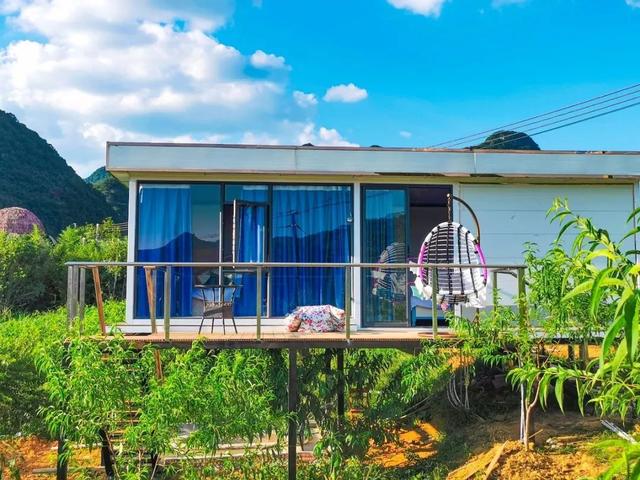 7套柜族民宿,200畝果樹環繞,由集裝箱、大片玻璃組合看著像木屋,其實更像心中的一座座桃花源。