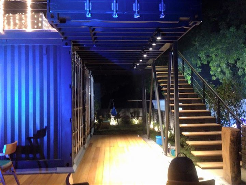 北面是由兩個平行排列的較小集裝箱形成的廚房。除此之外,通過入口門廳,人們登上金屬懸臂樓梯到露臺,作為自助餐廳或戶外聚會區。