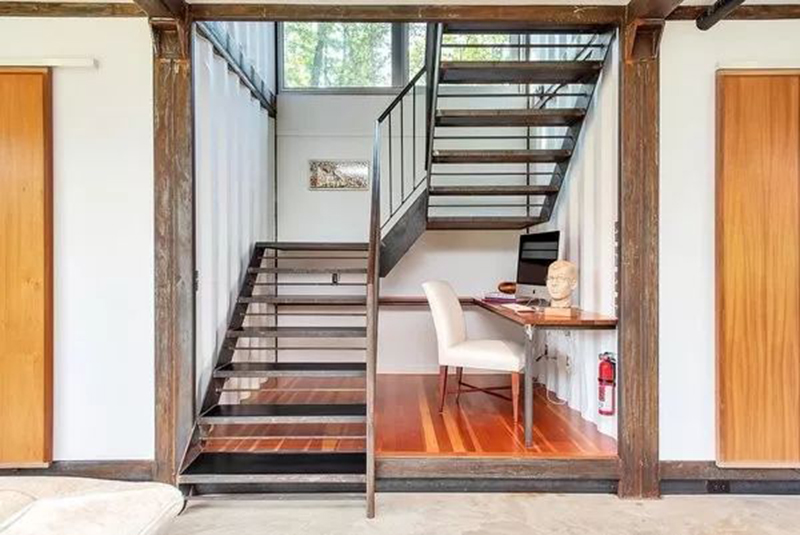 一個電腦角落隱藏在敞開的鋼制樓梯下面。