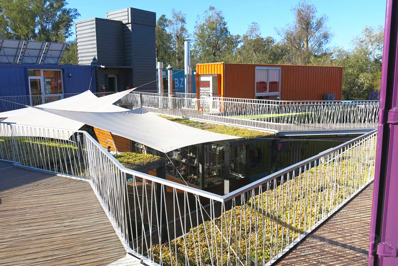 QUO Container Center的設(shè)計(jì)盡求可以做到綠色環(huán)保,大量的開放空間可以利用自然光線,轉(zhuǎn)換率較高的太陽(yáng)能板也被運(yùn)用到其中,提供電力。二樓部分平臺(tái)做了綠化植物的鋪植,隔熱的同時(shí)又美觀。