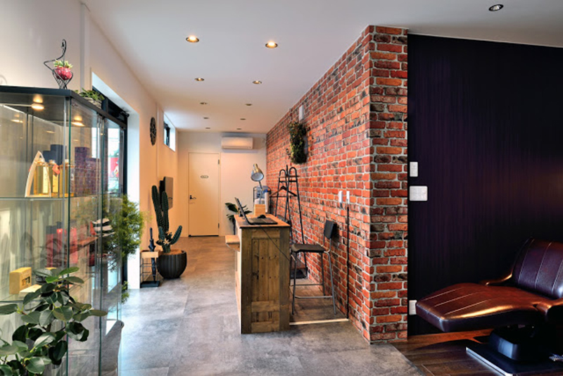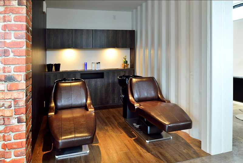 進(jìn)入沙龍,裸磚形象墻的服務(wù)前臺(tái)映入眼簾,左邊是休閑等候區(qū),配有沙發(fā)桌椅和電視,右邊是躺臥式?jīng)_洗處。