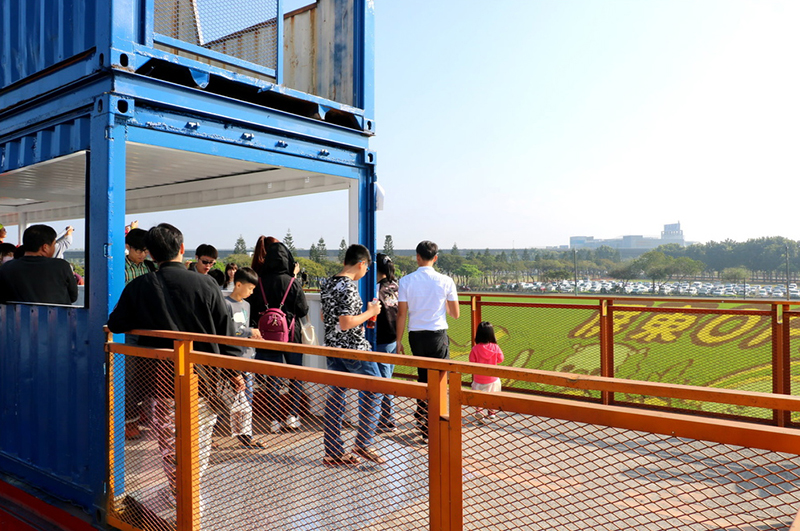 園區(qū)很大,因此也不止一座看臺。繼續(xù)往里走就會看到第二座集裝箱看臺。這是農(nóng)博必去的打卡點之一——彩繪稻田,從建筑的一端斜著往上進入,可以看到沿途的景色,到達(dá)最高處就可以看到完整的彩繪稻田地景藝術(shù),是一片以多色系彩稻打造的超人氣明星作品。