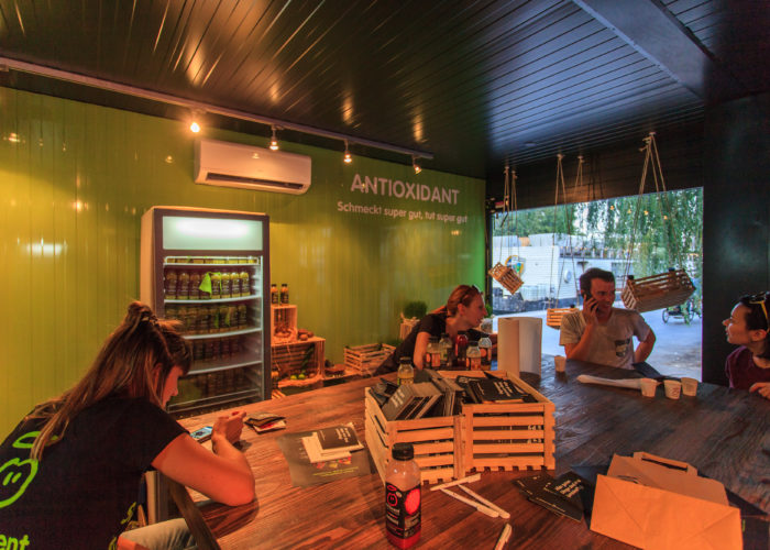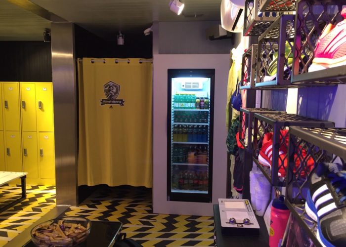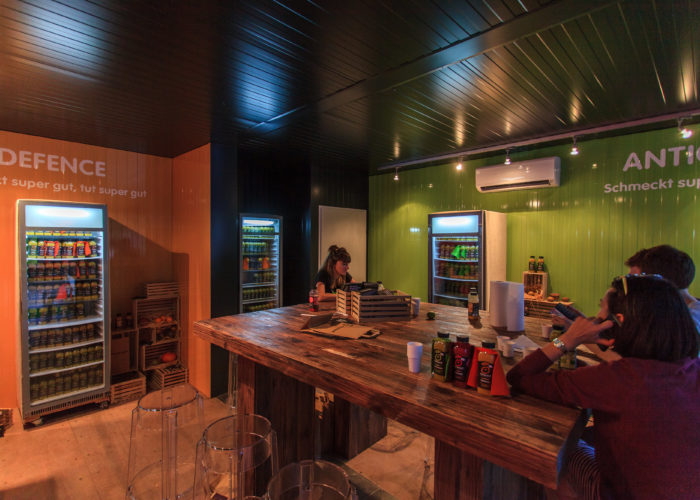 而室內則同樣是“看得見摸得著”的金屬制品,箱壁上富有質感的紋路,中間一張大桌子可供聚會,四壁都有放滿飲料的冰箱。為了提供宜人的室內溫度,空調必不可少。