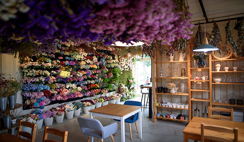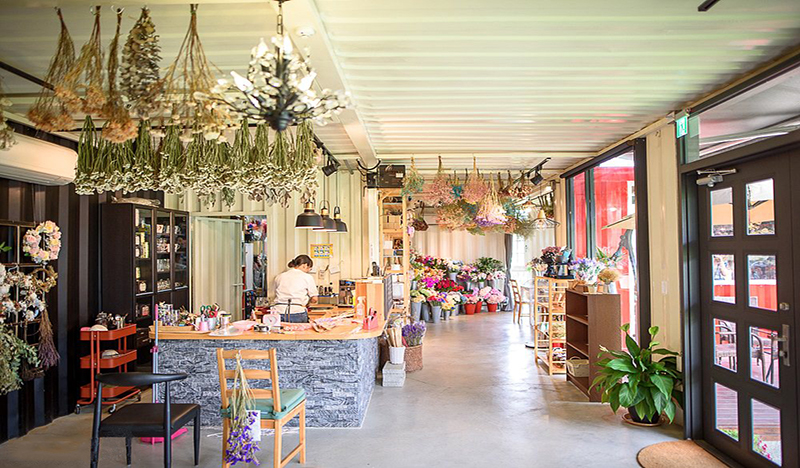 這是一家手作花坊,作為一座特色的集裝箱建筑,這里最大的優勢就是門前一個寬敞的庭院。鮮艷的色彩搭配突顯了環境的清新文藝,光是往院中一站就是網紅打卡點。