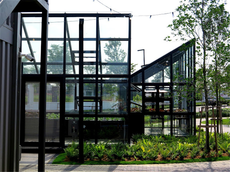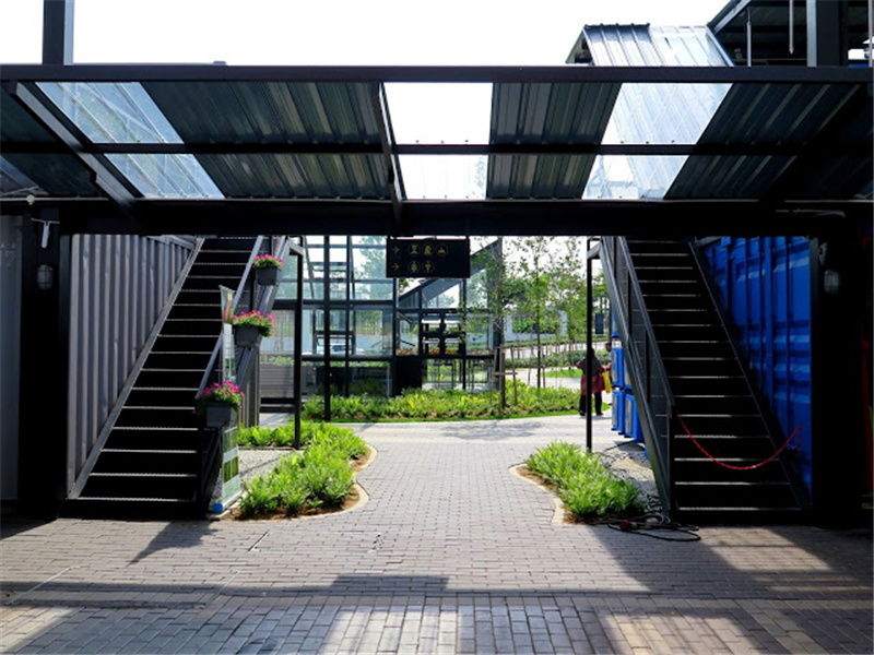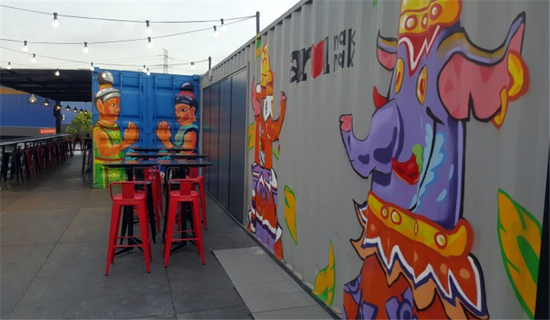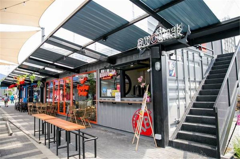 該集裝箱公園內建設了餐飲一條街,各種各樣的小餐館集成在聯排的集裝箱模塊中,并用不同的外殼顏色區分不同的店面。街道中間搭建了遮陽的頂棚,并放置了休閑的桌椅在走道上,可供游客們休息就餐。
