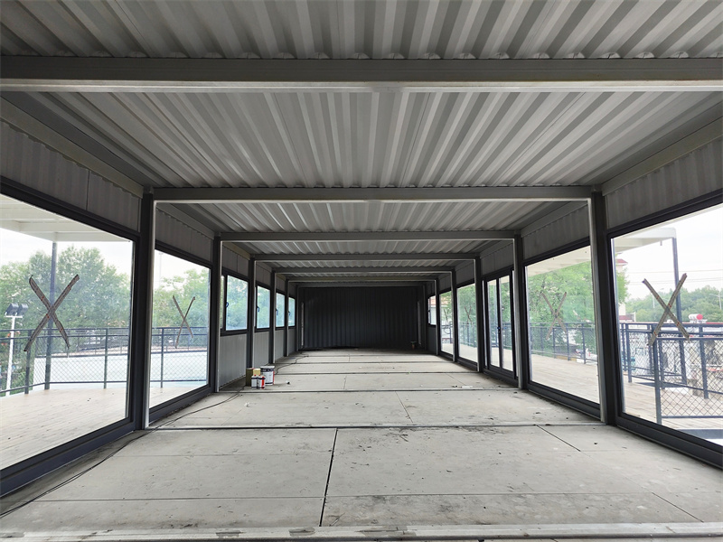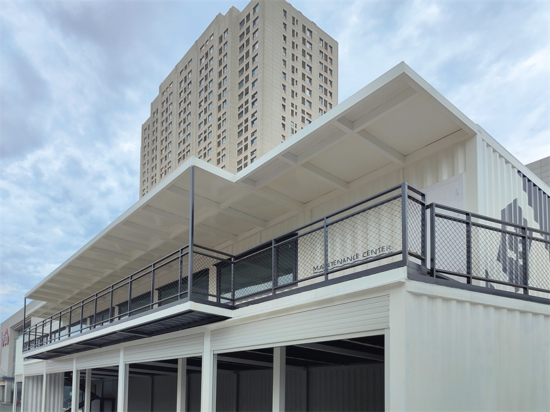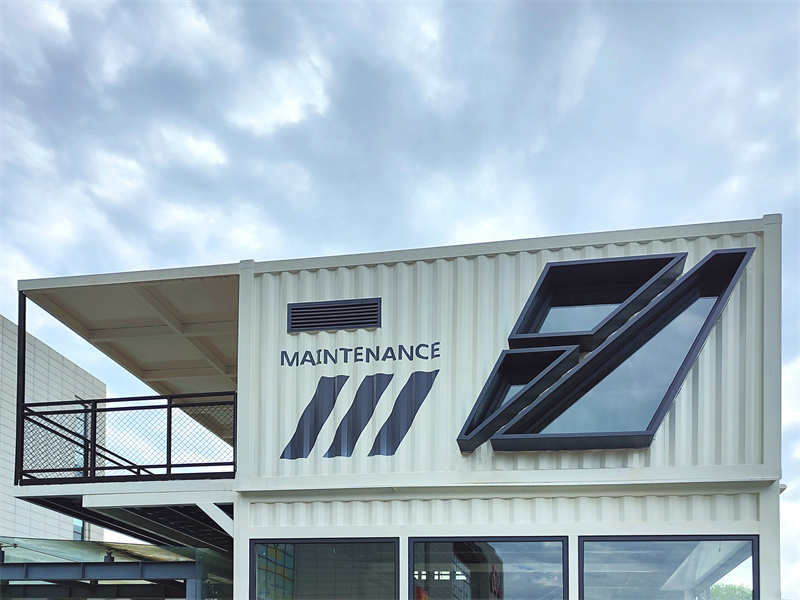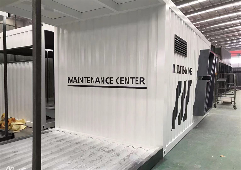 集裝箱以此形成方塊空間進(jìn)而形成方形平面,方形的平面以及不必要空間的抽取和移除打造了一個緊密分布的功能區(qū)域,也讓建筑合理運(yùn)用所有的動線空間。一層每個工位間隔為4米寬,能一次性同時進(jìn)行和容納7輛汽車的洗車和汽車美容保養(yǎng)工作。