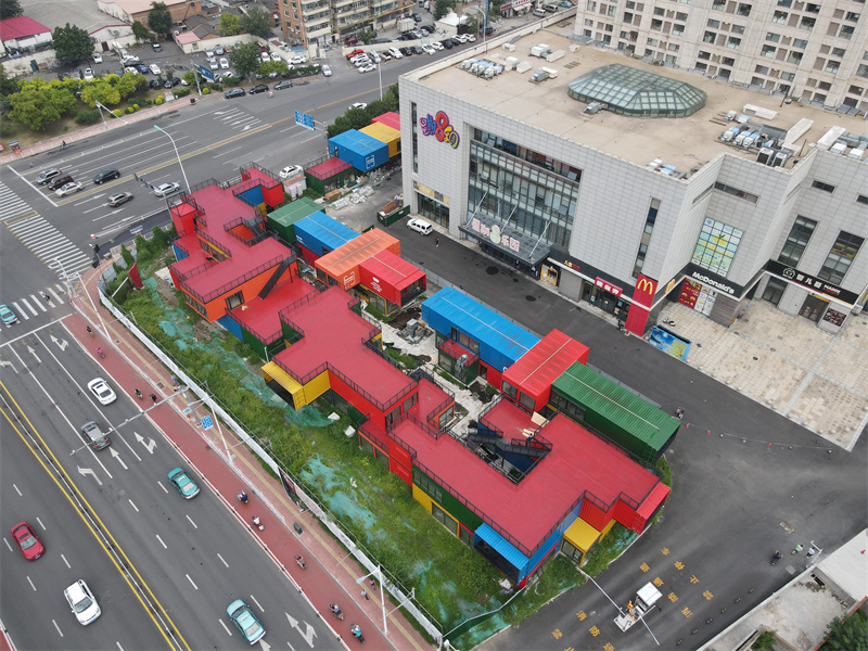 設(shè)計(jì)師從“街區(qū)”概念出發(fā),希望打造一個具有年前社群性、本土話題性、主體沉浸式的文化藝術(shù)商業(yè)街區(qū),同時也打造了一個集餐飲、休閑、購物、生活、運(yùn)動于一體的潮聚圣地。雖然集裝箱的組合相對密集,但也盡可能地避免建造封閉式的矩形體量,箱體的部分飄出與架空,使設(shè)計(jì)更有造型感。