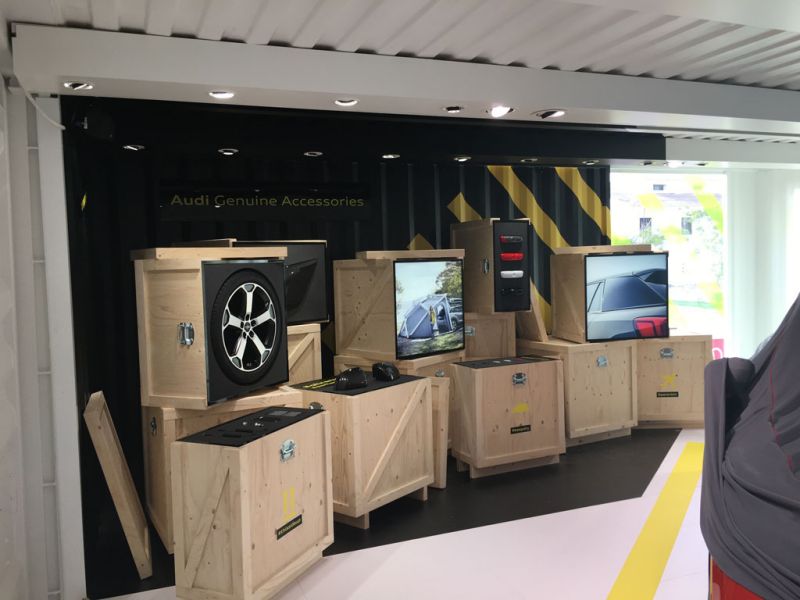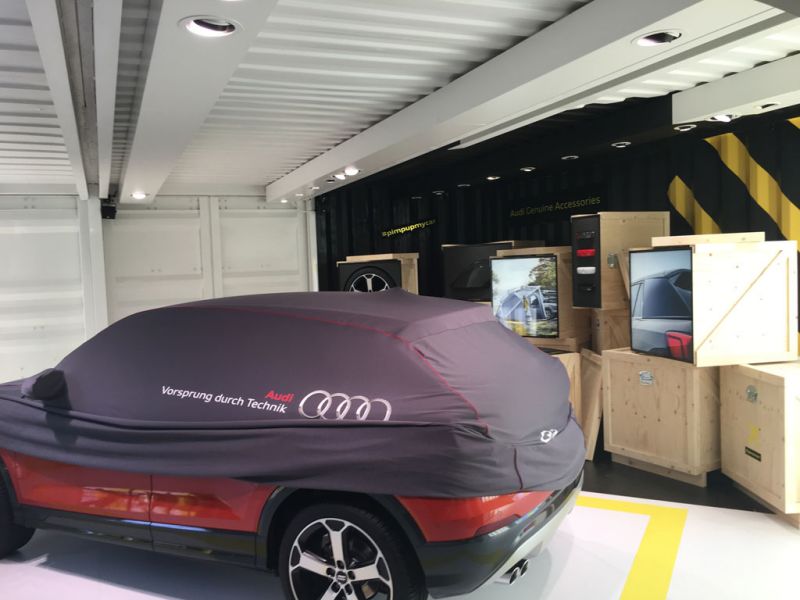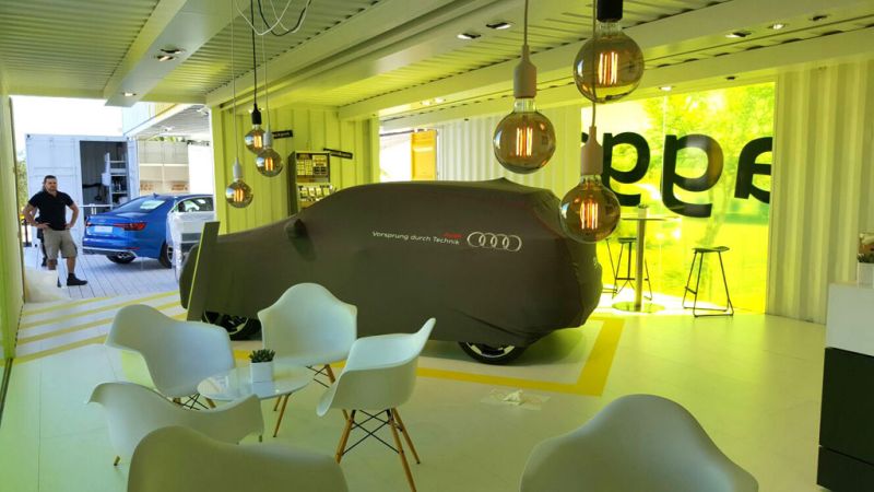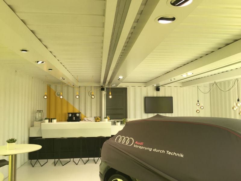 該模塊搭建的最初問題是需要空間來展示新的車輛模型,基于大容量和便捷性,奧迪展廳最終選用模塊化結(jié)構(gòu)打造。共有六個集裝箱單元搭建而成,結(jié)構(gòu)呈“品”字形。