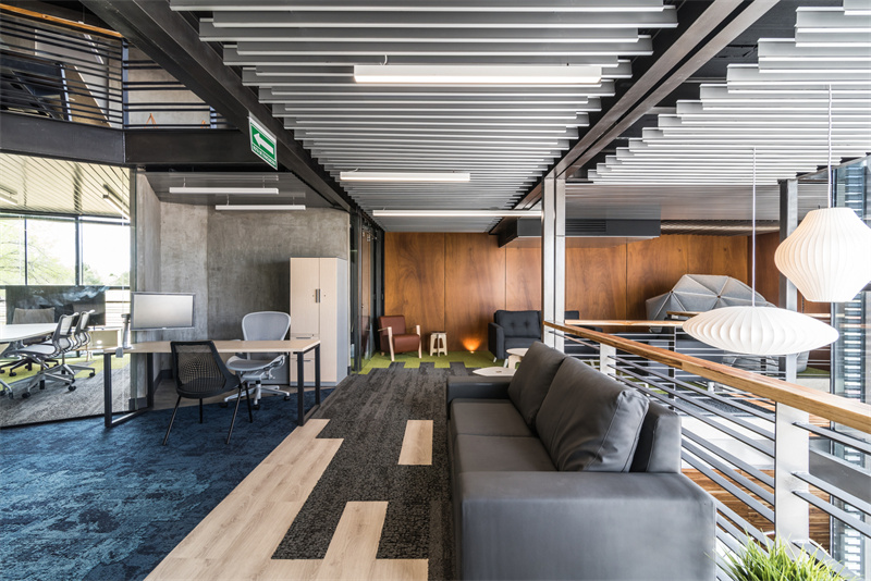 辦公空間采用了較為舒適的格調(diào),沒有墨守成規(guī)的辦公桌,卻提供了更自由的活動(dòng)空間和范圍,讓更多的創(chuàng)意在這里被激發(fā)。天花被一塊塊的金屬片裝飾,營(yíng)造了集裝箱波浪板的假象,地板由原木和布藝地毯交替鋪設(shè),倍感舒適。整片辦公區(qū)域都充滿了源于玻璃窗外的陽(yáng)光,讓空間更為明亮。