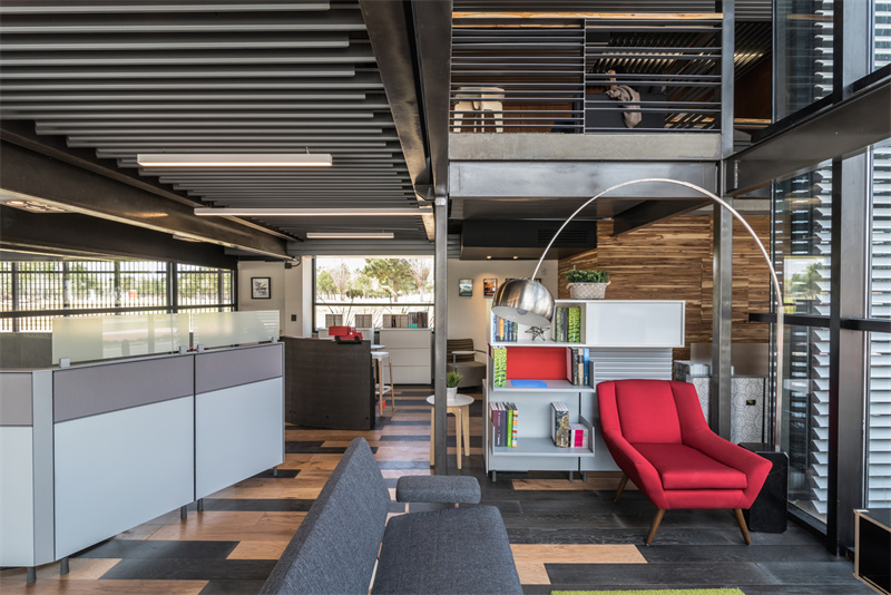 該辦公空間的設(shè)計(jì)包含了一系列在城市中脫穎而出的工業(yè)建筑,包括重復(fù)使用集裝箱作為建筑物的塊體分配器,將大面積的內(nèi)外可見落地玻璃窗、金屬和結(jié)構(gòu)梁等材料混合在一起,增強(qiáng)了建筑高新科技的主要特征。