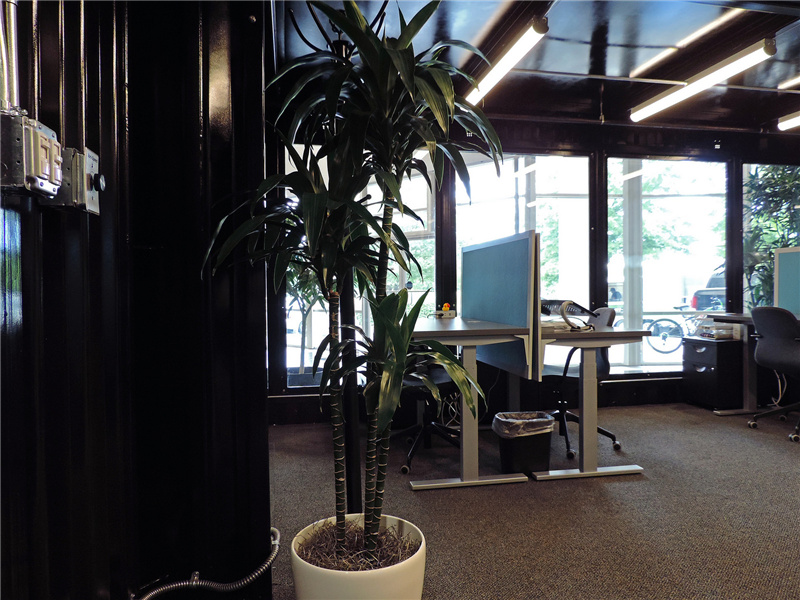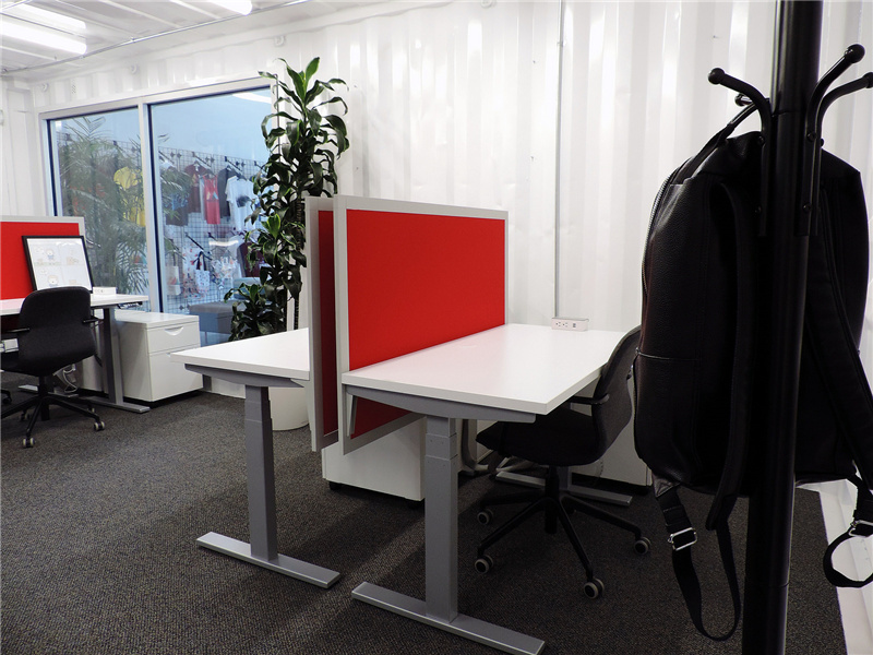 室內是紅色隔板的辦公桌,慣有的簡約格局。由于這個集裝箱辦公室是在室內的,因此并不需要太多的隔熱處理,即使是在辦公室里也能清晰地看到波浪板的紋路。