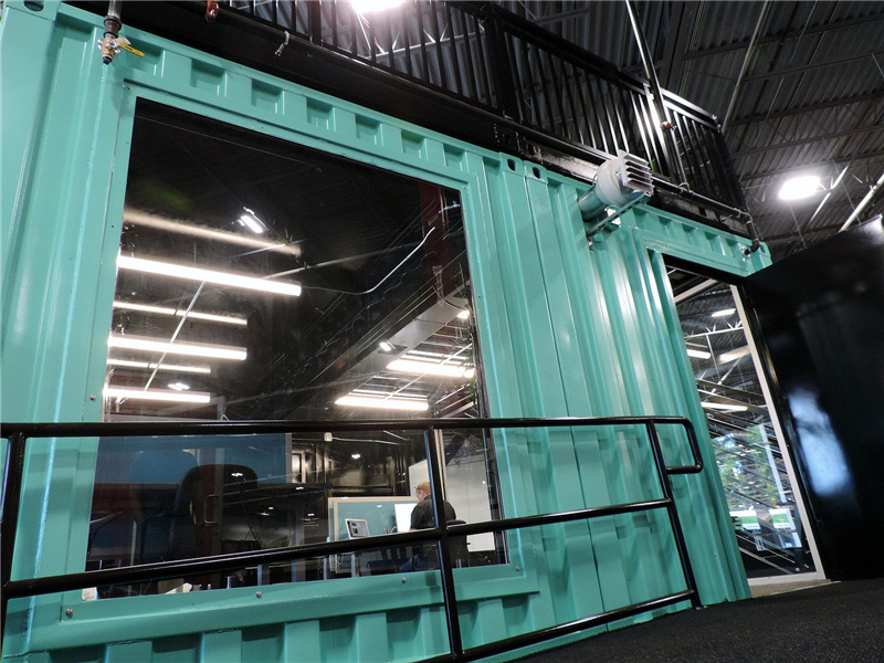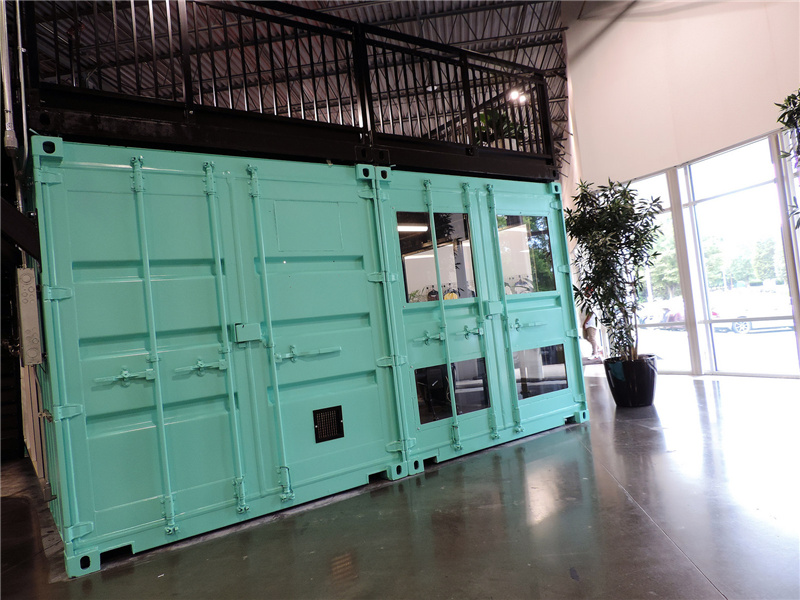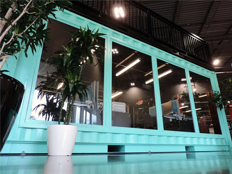 與紅色的集裝箱辦公室不同,這個藍色的集裝箱辦公室的里面采用了黑色的墻面,剛好與白色相對應,給人較為嚴肅的格調。