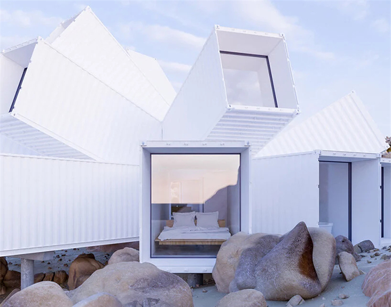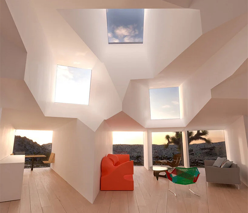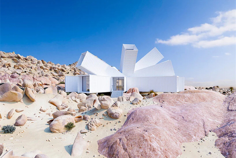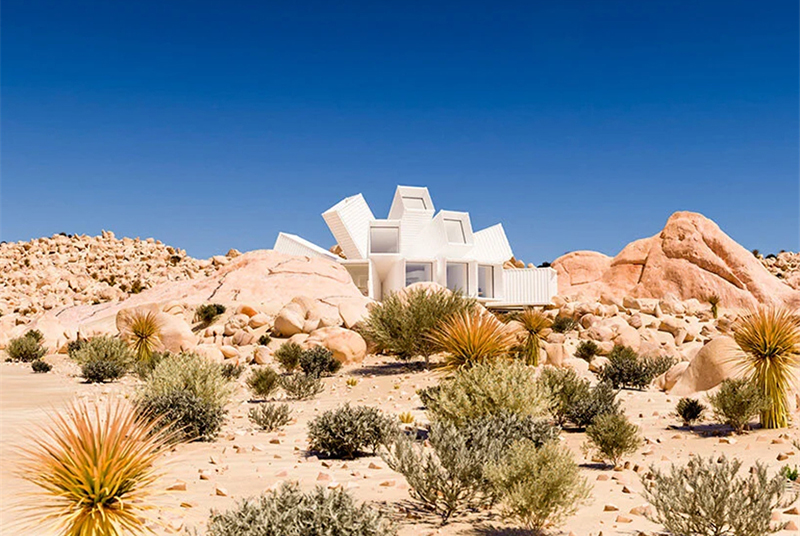 這所房子,被建筑師命名為“星爆”,從它的外觀中也能窺探一二,這所房子用集裝箱拼接組成,造型好似行星爆裂的瞬間,很有張力。而外墻則采用了白色的配色,在約書亞樹國家公園的荒漠中,顯得非常亮眼。