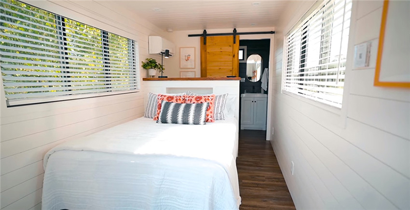 走廊的盡頭臥室又是一扇谷倉(cāng)門(mén),背面帶有鏡子;陽(yáng)光灑落在床上,說(shuō)不出的溫馨愜意~