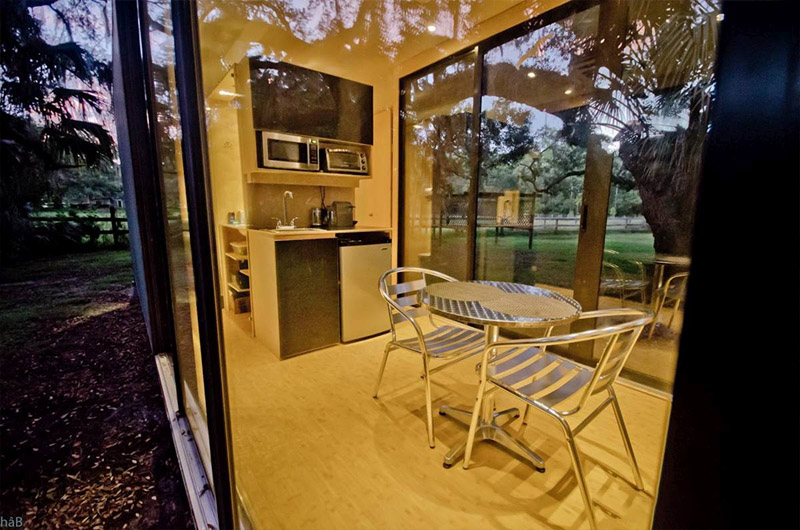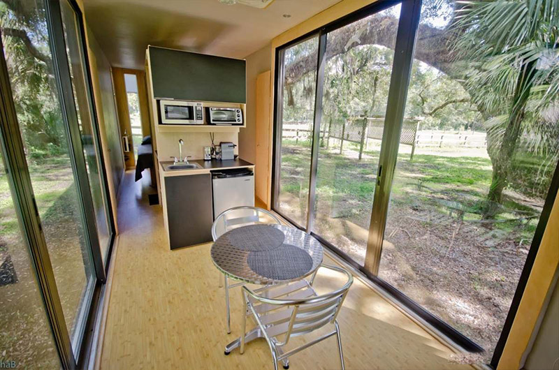 小屋一側(cè)的小廚房兼作分隔模塊,一個(gè)小桌子和幾把椅子被放在中間,就在兩組窗戶之間。