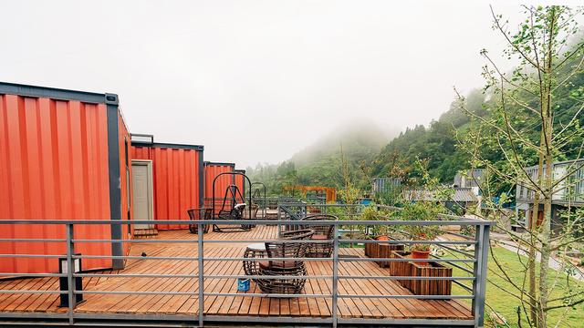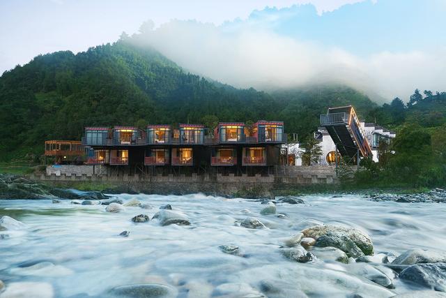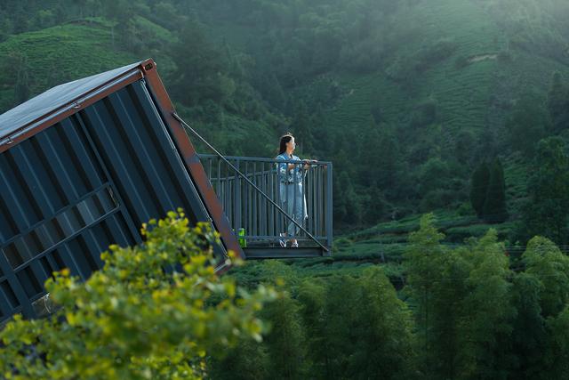 廂居位于素有"皖南金項鏈"之稱的宏儒公路旁,8000平方米的土地上只坐落了26間套,背靠茶山,前臨溪流,將46個集裝箱“勾搭”建于山水之間,久在樊籠里,復得返自然的田園之感油然而生。