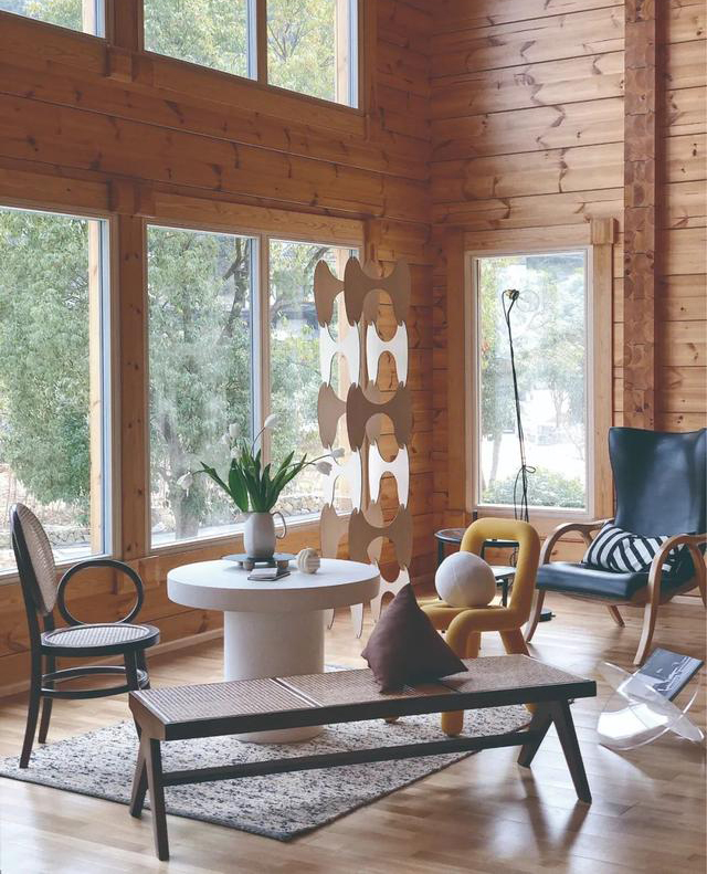 對Frank和曾曾來說,木頭是個活物,它會呼吸,能夠調節濕度.空間里如果過于潮濕,木頭會吸收濕氣,而如果過于干燥,木頭又會釋放水分。用這樣的木材搭建的木屋,本身已經足夠美了,因此Frank和曾曾基本保持了木材原本的樣子:“即便它有些疙瘩,也是自然的樣子。”