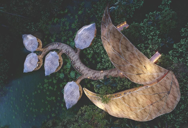 野奢的“奢”字,既指生活于自然之境的奢侈,也在強調硬件設施的品質。風餐露宿、日曬雨淋的戶外出游方式,只會將“出游”變成“吃苦”,旅途中非但得不到放松,身體反而更加疲憊了。因此,“奢”的意義就在于讓人們能夠安逸地去享受自然之野。但高品質的酒店、民宿雖不難尋,可要想在自然之景中建設酒店、民宿,現代都市化的建筑就多少有些格格不入了。自然的美景是無與倫比的,好的野奢酒店設計,當是自然美景的“點睛之筆”,是從自然中“生長”出來的,而非突兀地佇立其中。
